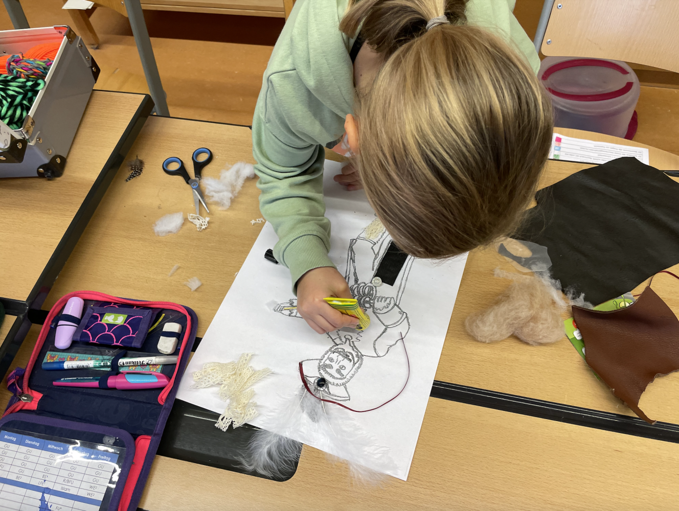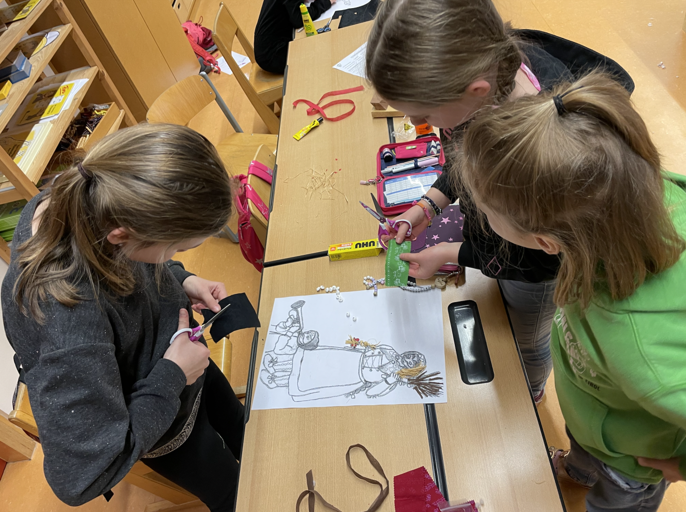 Um das Warten auf die Buabefåsnåcht zu verkürzen, gestalteten die SchülerInnen der dritten Klasse mit voller Begeisterung verschiedene Fåsnåchtsmasken. Mit Stoffen und Knöpfen, Federn und Wolle, Bändern und Farben hatten die Kinder die Möglichkeit, ihrer Kreativität freien Lauf zu lassen. Die Gemeinschaftswerke der FåsnåchtskünstlerInnen können sich mehr als sehen lassen.
