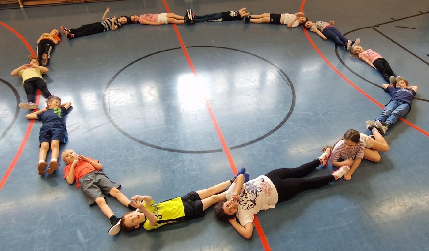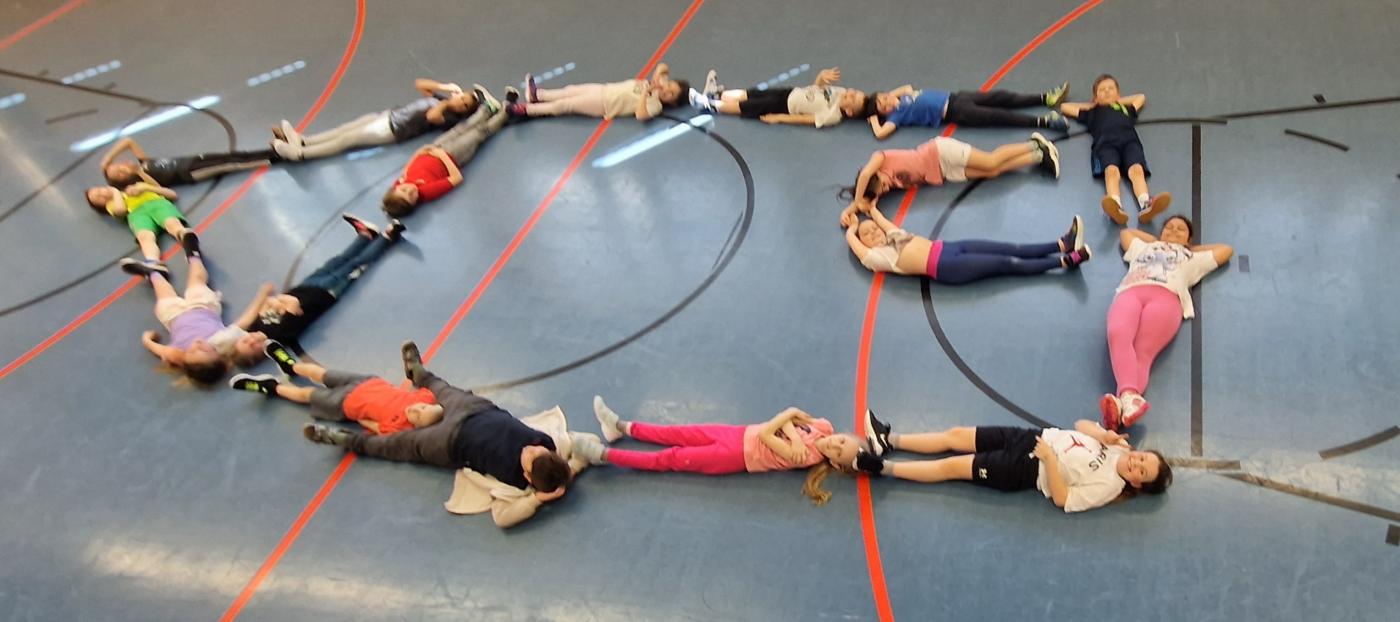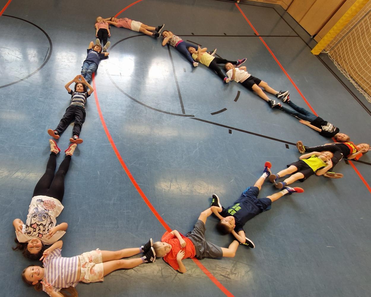 Die Kinder der 3a legen nicht nur Formen, sie liegen auch Formen. Eine Person gibt eine Form vor und die Kinder sollten diese - möglichst ohne zu sprechen - mit ihren Körpern als Gemeinschaftsbild darstellen. Wie man sieht, gelingt es ihnen sehr gut!