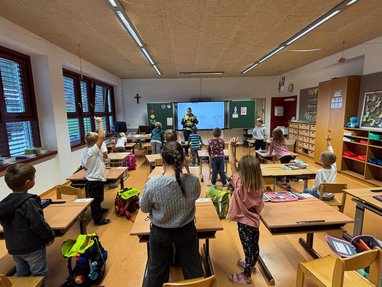 Sicher im Straßenverkehr von Alina Flunger 30. September 2025 1a 1b Die beiden ersten Klassen bekamen Besuch von der Polizei. Die Kinder lernten erste Verkehrszeichen kennen und übten gemeinsam mit der Polizistin das richtige Verhalten am Zebrastreifen und am Schulweg.